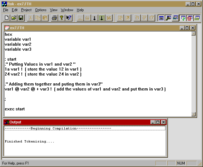 The following is a small example of an Open Boot Firmware system developed as part of an Honours project at the University of Paisley [Hob96]. Whilst a very simple system it illustrates some of the points of the previous section. In the first screen shot we see the full environment: Notice the button bar giving access to the various views/operations provided by the environment. This example shows the system after a successful compilation. The "Output" window shows the output/error report from the compilation process.