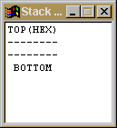 "Dictionary" Window3 The "Stack" Window: The current status of the data stack is shown in this window. The values on the stack are shown as hex values, but can be switched to decimal values.