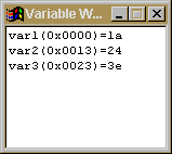 "Stack" Window4 The "Variable Watch" Window: This shows the variables associated with the system, and their current value. As with the stack windows these values are shown in hex but can be switched (by means of an option) to decimal.